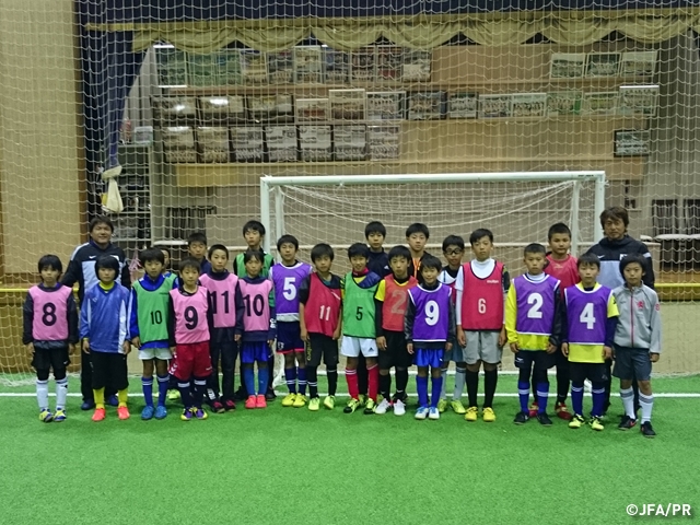 30日は東北ユースダイレクターの山崎氏と共に福島県の会津地区U-11/U-12トレセンに伺いました。この日はあいにく雨のため、会場をサントスアリーナに変更。広さはフットサルコート一面弱の体育館のため、U-11はパス&コントロールと4対2、そしてゲームを、U-12はシュート練習とゲームというメニューで練習しました。1時間の短い練習でしたが、どの選手も意識高く取り組んでくれました。