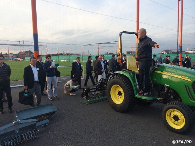 16日(月)は東京のJFAハウスにて、JFA施設委員の池田省治氏を中心に大宮アルディージャの練習場整備の事例を取り上げ、最先端の天然芝ピッチの維持管理から整備の手法を学びました。実際に大宮アルディージャの練習場にも訪れ、クラブハウスの視察、天然芝ピッチのメンテナンス器具などについても詳しく紹介しました。