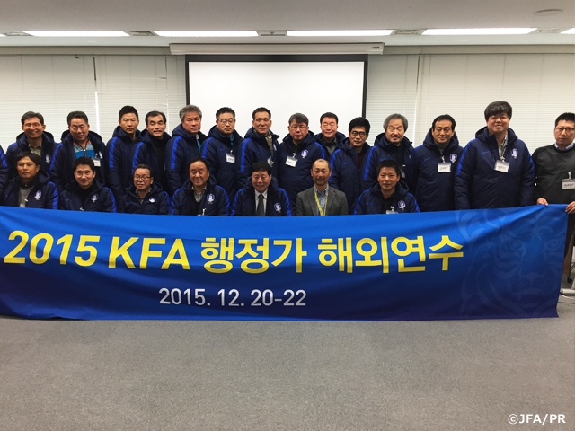 12月21日(月)韓国各地域サッカー協会の専務理事14名と韓国サッカー協会関係者7名の計21名が、日本サッカー協会の組織体制や都道府県サッカー協会との関係性ついて知識を得るため、JFAハウスを訪問し、JFA主催のセミナーを受講しました。質疑応答では多くの質問があがるなど、熱のこもったディスカッションが見られました。セミナー終了後は原専務理事も昼食会に参加し、親交を深めました。また午後からは東京都サッカー協会を訪問し、都道府県サッカー協会の事業や組織についての説明を受けました。