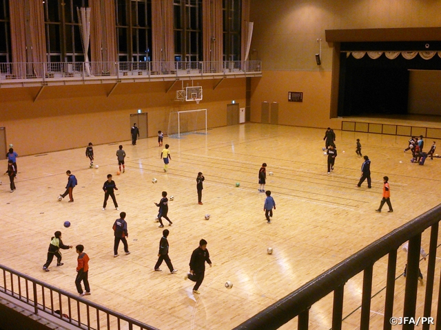 同5日のフェスティバルには、沿岸の11チームと小学校の低学年が65人、高学年が171人、指導者、保護者、スポーツ少年団OBなど、全員合わせて363人もの人たちが参加してくれました。ナショナルトレセンコーチ東北担当の都修一氏にサポートしていただき、アイスブレイクからボールフィーリング、ゲームまで楽しく行いました。子どもたちはコーチの話をよく聞き、積極的にプレーしてくれました。午後は、大人(指導者・保護者)にも楽しんでもらおうと、3面に分かれて大人対子どものゲームを行いました。大人の疲れ具合を見て、終わりのタイミングを計っていたのですが、意外にも大人チームは果敢にゴールを決めるなど、約2時間動きっぱなし。日頃のストレスを発散しているかのようでした。終わった後にJFAスタッフと指導者の皆さんとのフットサルも予定していましたが、流石にこちらは断念(笑)。皆で楽しい時間を共有することができました。今年も継続していきましょう!