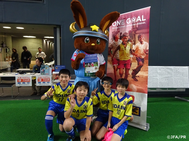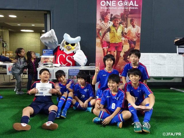 この歴史ある大会の期間中に北海道サッカー協会の協力の下、ONE GOALキャンペーンの普及・啓発活動を行ないました。大会に参加した選手やご家族、サッカーファミリーの皆さんに、アジアの子どもたちの食に関する現状を伝えるチラシを配布するとともに、募金活動を実施しました。北海道コンサドーレ札幌のドーレ君、そしてエスポラーダ北海道のリスポも、ONE GOALブースを訪れ、参加された方々への食の重要性のアピールや募金活動に協力してくれました。