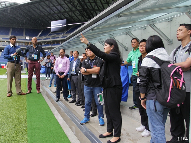 市立吹田サッカースタジアムでは、国際試合を開催するために準備された記者会見場、ロッカールーム、ピッチ、VIPエリアを視察し、参加したメンバーは自国スタジアムとのオペレーションの違い、施設の違いを体感しました。続いて行われたJFAアカデミーおよび指導者養成に関連する講義ではJFAの目的、目的を達成するための手段について話され、多くの質問があがって活発な討議が行われました。