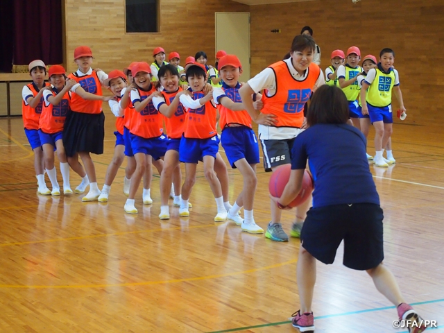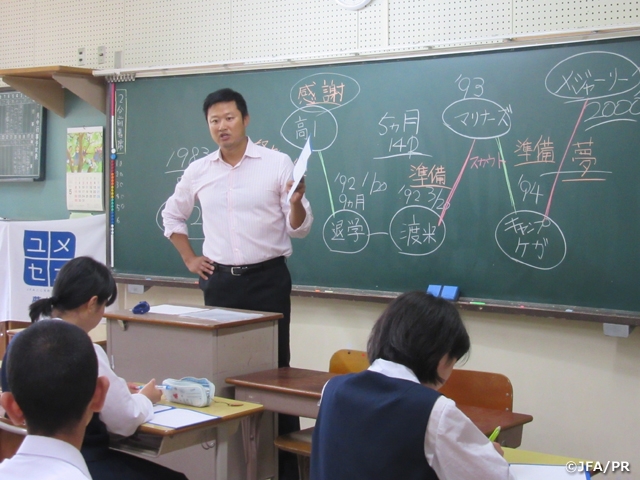 岡山県高梁市は2011年度にJFAこころのプロジェクトに関する協定を締結し、現在は市内の全小・中学校で「夢の教室」を実施しています。今年度は、20校20クラス470人の子どもたちが、サッカーや野球、陸上、水泳、テニス、ソフトボールの元選手である夢先生と出会いました。