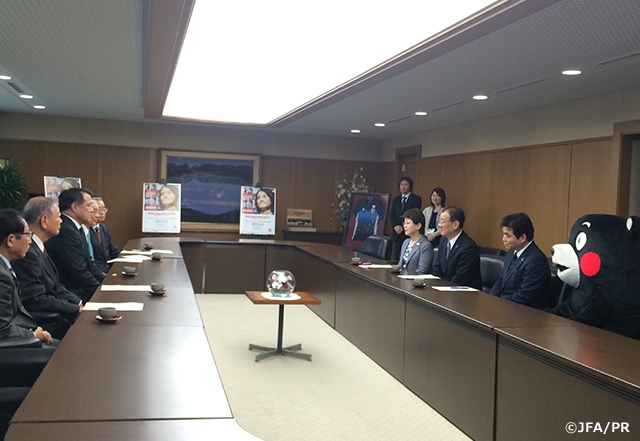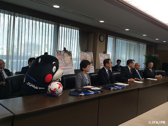 「キリンチャレンジカップ2017~熊本地震復興支援マッチ がんばるばい熊本~」を4月9日(日)に熊本県民総合運動公園陸上競技場で開催することを受け、日本サッカー協会 田嶋幸三会長が10日(金)、熊本県 田嶋徹副知事、宮尾千加子教育委員長、くまモン営業部長を表敬訪問しました。