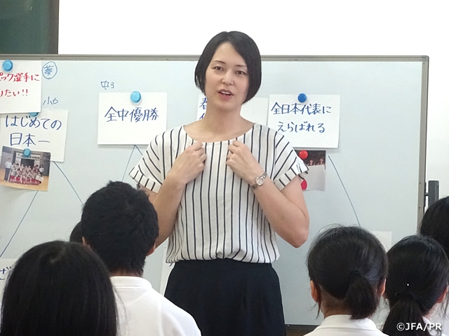 体育館でゲームをしていくうちに、だんだんと距離が縮まり、クラスで協力することを一緒に楽しめました。みんなの笑顔が印象に残っています。トークの時間ではサッカーを始めたきっかけから、夢を叶えた時も、苦しいことや辛い事があった時も、支えてくれる人や応援してくれる人がいたことや、いつでも自分を信じて、今できることを考えて行動してきたことを伝えました。この「夢の教室」で、夢と向き合い、自分を信じて夢に向かってくれたら嬉しいです。その夢を私も応援しています。