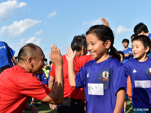 2017年初めてとなる「JFA・キリンビッグスマイルフィールド」が9月10日(日)に、岩手県宮古市の宮古運動公園陸上競技場で開催されました。これまでJFA・キリンスマイルフィールドとして、東日本大震災後6年間で693の小学校を訪問し、学校の授業のなかで元サッカー日本代表によるサッカー教室を行ってきました。今年からは子どもたちの笑顔が大人の笑顔に、地域の笑顔が東北全体の笑顔につながるようにさらに進化したサッカーイベント「JFA・キリンビッグスマイルフィールド」として行われることとなりました。