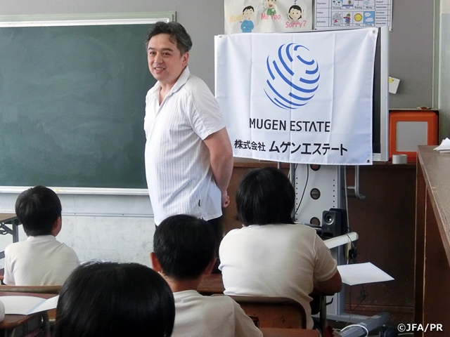 本年度よりJFAこころのプロジェクトへ協賛いただいた株式会社ムゲンエステート。初の「夢の教室」が行われた福知山市は、藤田進代表取締役会長の出身地です。夢先生を務めた元サッカー日本代表の山田隆裕さんは、夢を持つことの素晴らしさやあきらめないことの大切さを子どもたちに伝えました。