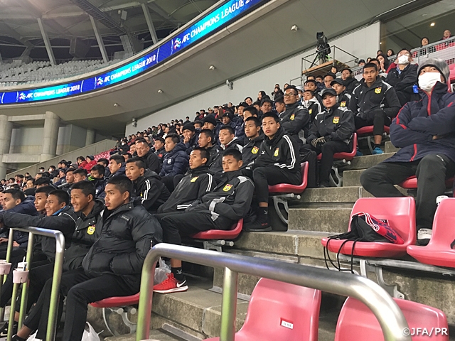 また、この日の最後には鹿島で行われたAFCチャンピオンズリーグ第4節「鹿島アントラーズ対シドニーFC(オーストラリア)」の試合を観戦しました。初めてAFCチャンピオンズリーグを観戦する選手や役員も多く、真剣に試合に見入っていました。また鹿島アントラーズのサポーターの応援を気に入った選手達が見よう見まねで応援する姿も見られ、試合観戦を満喫していました。