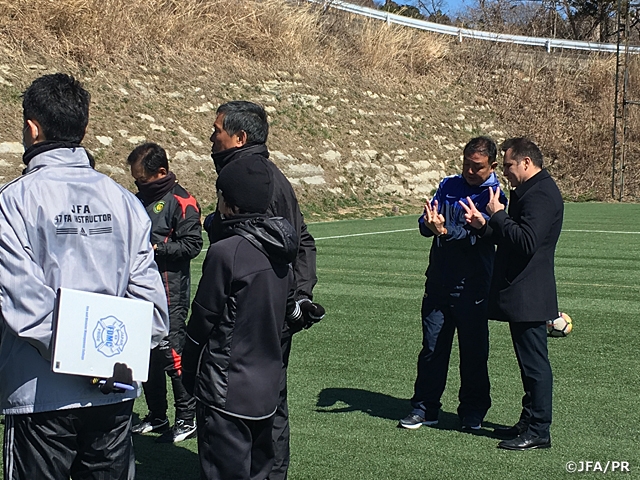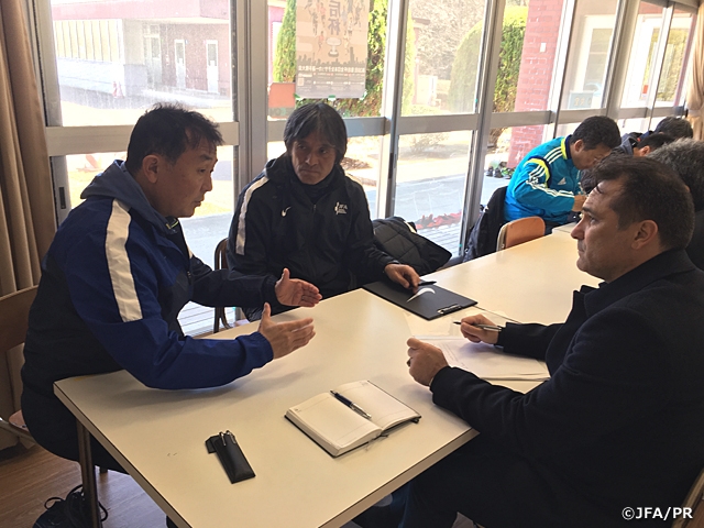 今回の来日の目的は、イランと共にアジアのサッカー/フットサル先進国といえる日本の指導者養成コース全般の仕組みについての視察や意見交換です。来日期間中は、宮城県の松島フットボールセンターにて実施されたC級コーチリフレッシュ研修会を視察し、その際に鈴木淳JFA指導者養成ダイレクター/小野剛JFA指導者養成インストラクターとディスカッションしました。また、明治安田生命J1リーグ浦和レッズ対横浜F・マリノスの試合を視察したほか、JFAハウスにて望月一頼JFA指導者養成サブダイレクター、小西鉄平JFAフットサルテクニカルダイレクター、指導者養成に関わるJFA事務局員からのレクチャーを受け、意見交換を行いました。