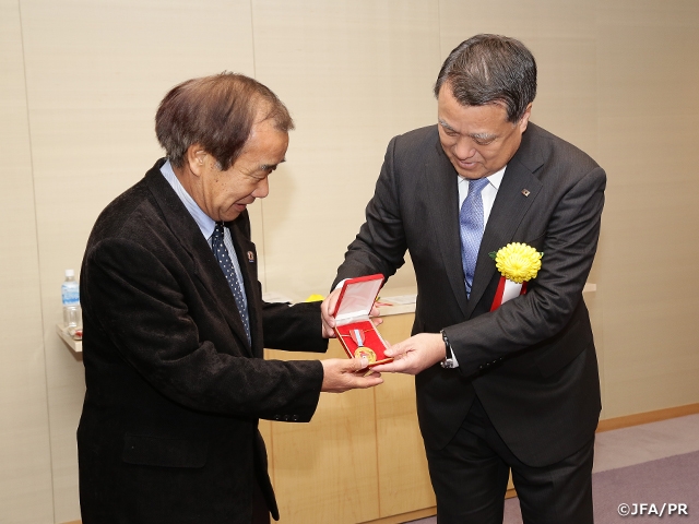 この度、派遣先における貢献が高く評価され、モンゴルU-15/U-18女子代表の壱岐洋治監督がモンゴルサッカー連盟から勲功徽章を授賞し、田嶋JFA会長を通じて手渡されました。また、ブルネイU-22代表の監督を務めた藤原孝雄氏は、在ブルネイ日本国大使より在外公館長の表彰を受けました。