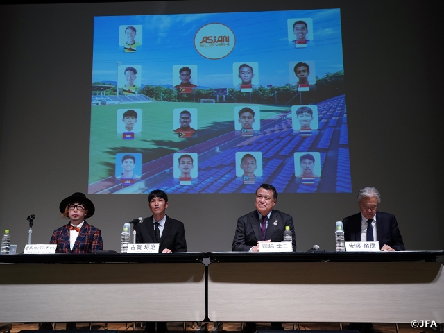 会見には国際交流基金から安藤裕康理事長、日本サッカー協会からは田嶋幸三会長、今回ASIAN ELEVENを率いる古賀琢磨監督、そして今回ASIAN ELEVENのユニフォームデザインを手がけたアートディレクター・増田セバスチャン氏の4名が登壇。