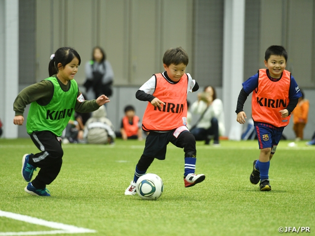 小学生を対象としたサッカー教室を中心に、 来場者参加型のサッカーアトラクション、地域のグルメを楽しめるマルシェコーナーなど、来場者や地域の方みんなが笑顔になれるサッカーイベント「JFA・キリン ビッグスマイルフィールド」が11月24日(日)に福島県のJヴィレッジで開催され、およそ800人の子どもたちが笑顔でボールを追いかけました。