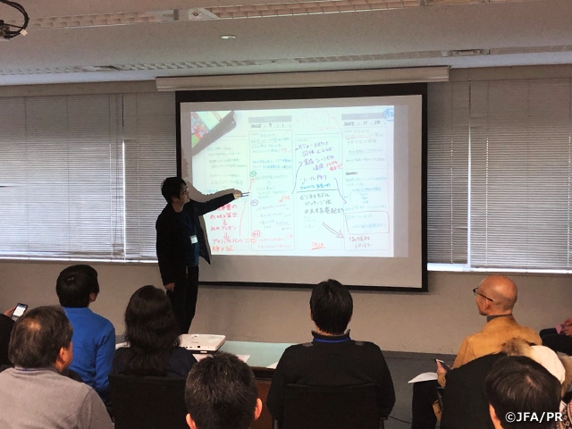 講座では、それぞれの受講生が持つサッカー・スポーツや人生のビジョン・思いを、文字やビジュアルとして整理し、併せて社会の流れや身の回りの環境を客観的に分析しました。次にそれらをどううまく結び付け、各自が向き合っているサッカー・スポーツ、そして地域の課題を解決していくか、新しいものを創り出していくかを考えました。そして、他の受講生とも積極的に意見を交換しながら、それぞれのゴールとそこに向かう道筋を明確にし、その道筋を具体的な行動計画に落とし込んでいく作業を丁寧に積み上げました。