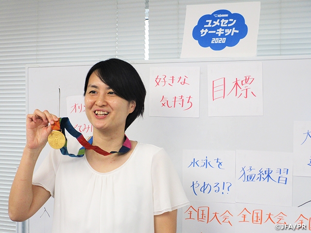 香川県の小豆島にある土庄小学校と、東京のJFAハウスをオンラインでつないでの授業担当したのは、アーティスティックスイミングの荒井美帆さん。自身が競技を始めるようになったきっかけや、競技を続けていく中でのその時々の気持ちなどを、丁寧に子どもたちと共有しながら話を進めていきました。