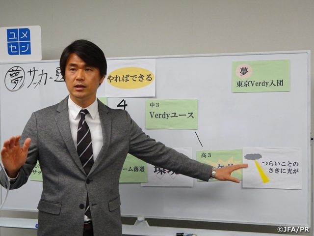 またトークの時間では、戸川さんが自らの夢だったプロサッカー選手になるまでに経験したいろいろな出来事を夢曲線で上がったり下がったりしたことが有ったことを語りました。中学時代に取り組んだ勉強が「自分もやればできる」と思わせてくれるきっかけになったというエピソードや、怪我をした時に取り組んだ体幹トレーニングが復帰した後に活きてきたという話から「苦しい時や上手くいかない時も自分にできることを積み重ねることが大切」と生徒たちに伝えました。