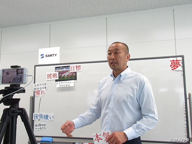 PRタイムが終わると、今回夢先生として登壇したのは、元ラグビー日本代表の伊藤剛臣さんです。まずは、子どもたちと夢先生の距離を縮める「出会いの時間」からスタート。画面からはみ出るくらいの熱い伊藤先生にまつわるクイズや、現役時代の映像などを交え子どもたちと夢先生のこころの距離を縮めていきます。「トークの時間」で伊藤先生は、子どもの頃にどんな子どもだったのか、夢を見つけてその夢に向かっていった姿を話していきます。トークの時間の途中で、子どもたちは手元にある夢シートに、いま好きなことや、自分の夢などを記入していきます。