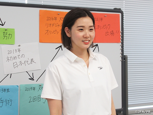どうやったら子どもたちに自分の思いが届くだろうか、どのように伝えたらいいのだろうか、と考えながら資料を作っていました。当日、とても緊張していたのですが、JFAのスタッフのみなさんのサポートや子どもたちの元気な姿に助けられ、私もリラックスしながら楽しんで夢の教室を行うことができました。そして、子どもたちの熱心に話を聞いてくれる姿、夢シートを書いてくれる姿にとても刺激をもらい、何かに一生懸命な姿は人の心を動かすものだと私自身改めて感じられる「夢の教室」になりました。これからもっとたくさんの人に自分の思いが伝えられるように経験を積んでいきたいと思います。