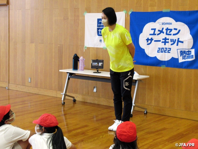 菊川小学校5年生の授業に登壇したのは、元なでしこジャパンの小林弥生さん。従来の「夢の教室」で実施していた、子どもたちと夢先生が体を動かす体育館での「ゲームの時間」と教室での「トークの時間」では、感染対策ガイドラインに基づきながら参加者全員がマスクをしたままでの授業となりましたが、実際に夢先生に会えて子どもたちは目を輝かせながら授業を楽しんでいました。