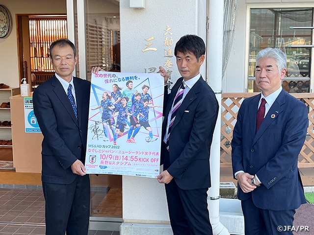 試合を翌週に控えた9月29日(木)には、なでしこジャパン(日本女子代表)の池田太監督とMS&AD インシュアランス グループ ホールディングス株式会社の松浦俊嗣 広報・IR部長が、今回ご招待をする児童養護施設・三帰寮に訪問し、手渡しでMS&ADカップ2022の観戦チケットと、記念品のボール・ポスターを贈呈しています。
