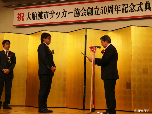9日の記念式典には、戸田公明市長、佐藤隆衛体育協会会長、岩手県サッカー協会の嶋誠会長が駆けつけてくださいました。小笠原満男(鹿島アントラーズ)選手の講演も行われ、和やかな式典となりました。また、大船渡市サッカー協会の佐々木孝逸会長から日本サッカー協会に対し、感謝状が授与されました。