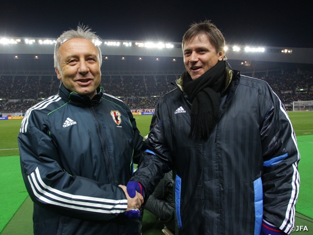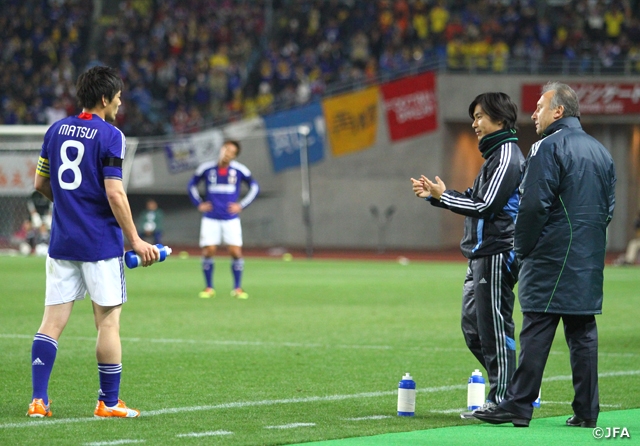 試合に合わせて海外組が戻り、3日間の練習は公開にして、練習前には募金活動を行いました。そこに長い行列ができ、行列を何列かに分けて、選手で分担しながら即席の握手会も行ったと記憶しています。私の近くにキャプテンだった長谷部誠がいたのも覚えています。列に並んだ人たちが笑顔になってくれたことが強く印象に残っています。集まった選手の顔ぶれを考慮すれば、試合は真剣にやるべきだと思いました。それで3-4-3のシステムに挑戦させました。先発はGKが川島永嗣、3バックは右から吉田麻也、今野泰幸、伊野波雅彦、MFは右のウイングバックが内田篤人、左が長友佑都、長谷部と遠藤保仁がボランチで、3トップは右から本田圭佑、前田遼一、岡崎慎司でした。試合を通じて3ゴールが生まれましたが、自分たちが決めたゴールはあまり覚えていません。どんなふうに相手にアプローチするのか集中していたせいもありますが、何より自分たちが決めたゴールより、三浦知良に決められたゴールの記憶の方が大きいせいでもあります。私は練習試合でもゴールを決められるのが嫌いな人間です。それがあのときは初めて相手にゴールを決められてうれしくなりました。日本のプロサッカーの歴史ともいえる三浦がゴールを決めたことは、あの試合の何かを象徴する、特別なエピソードだと今も思っています。もっとも、私はミスを必ずしっかりとチェックするタイプの監督なので、マークをルーズにしていた森脇良太を呼んで「集中しろ」と注意もしました。そのゲームでというよりも、彼の将来を見据えた上で助言したのです。Jリーグ選抜の監督がドラガン・ストイコビッチだったのも喜びでした。彼のことは彼の選手時代からずっと尊敬していたからです。今でも彼のゴールシーンを集めた動画を見ては楽しんでいるほどです。彼のベストゴール? それは間違いなく、名古屋グランパスの監督時代に、ベンチ前から横浜F・マリノスのゴールに革靴で蹴り込んだ一撃でしょう。