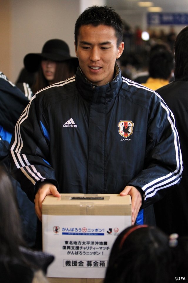 実際に被災した東北や関東と異なり、大阪は計画停電等の影響も小さく、常と変わらない日常のように感じました。それでも、公開した練習に集まったファン・サポーターからは募金活動などを通して、被災地・被災者に対して何か行動したいという強い思いを感じました。その気持ちは、集まった選手やザックさん(アルベルト・ザッケローニ監督)、チームスタッフ、JFAの人たちも同じでした。練習後の募金集めにしても別に誰かが率先したわけではなく、みんなが同じ思いを持っていたから自然に行動に移せた感じでした。このチャリティーマッチから、地震や台風などの被害に遭われた方たちに対して、JFAやJリーグ、Jクラブが試合会場などで募金活動を行い、被災地に届けることに積極的になった気がします。そういう形がここで一つできたのも、意味のあることだと思います。
