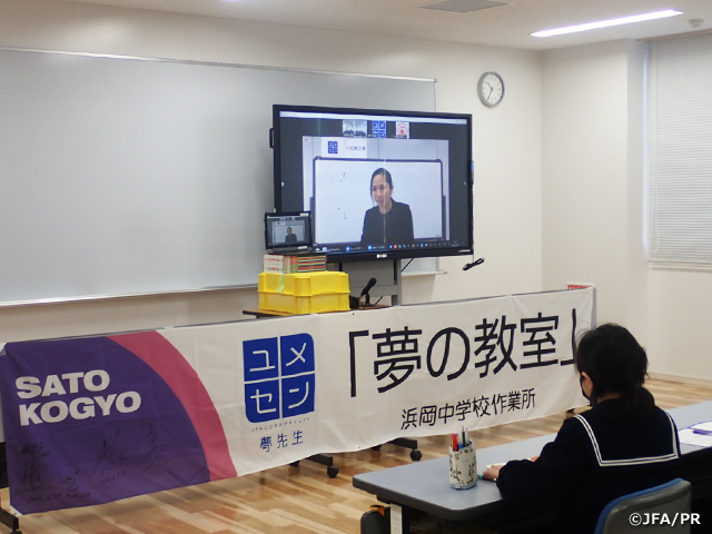 JFAこころのプロジェクトは3月15日(月)から17日(水)の3日間で、佐藤工業株式会社の支援による「夢の教室」オンラインを、同社名古屋支店にて新校舎の建設工事を請け負った御前崎市立浜岡中学校で開催しました。
