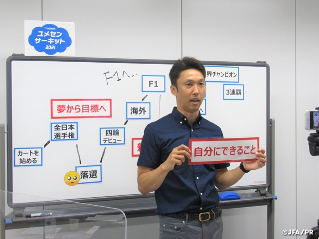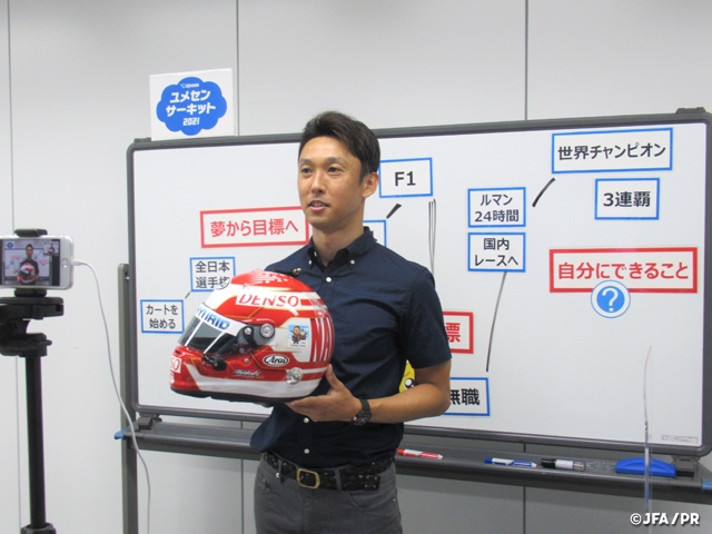 子どもたちに自身の経験を伝える「トークの時間」では、この日のために作り込んだメッセージパネルと写真、実際にレース中に使用しているヘルメットなどを見せながら、一生懸命に子どもたちに語りかけました。