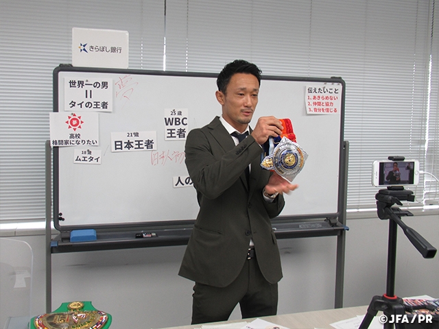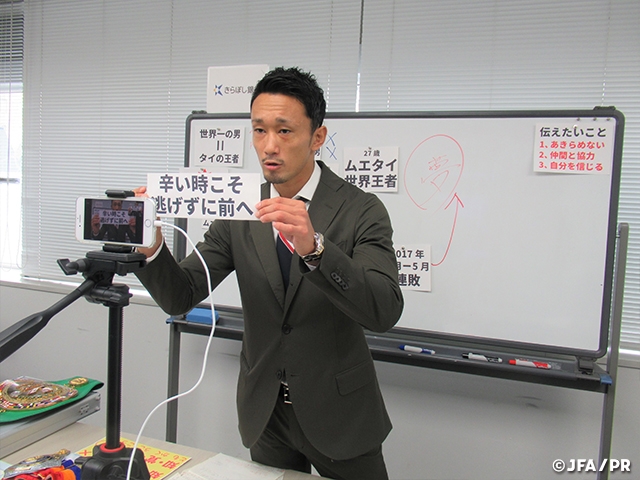 「トークの時間」では、格闘技をはじめたきっかけから、ムエタイの世界チャンピオンになるまでの苦難の道のり、そしてチャンピオンになった後、怪我を負った状態で臨んだ防衛戦に破れて打ちひしがれても、また今も新しい夢を追っている自身の気持ちを赤裸々に語り、苦しい時こそ「あきらめないで、逃げずに一歩前に足を踏み出すこと」、「自分を信じること」が大切だと子どもたちに伝えました。