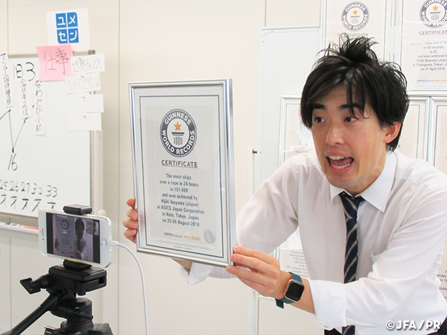 12月20日に新宿区立淀橋第四小学校2クラスの授業に登壇したのは、Eテレなどでも活躍するプロ縄跳びプレーヤーの生山ヒジキさん。授業が始まる前の「出会いの時間」では、実際に縄跳びでいろいろな技を披露してくれました。オンラインであっても、普段から縄跳びに親しみのある子どもたちに、その凄さが画面越しに伝わっていきました。縄跳びを跳んだ場所から移動して「トークの時間」になると、ヒジキ先生の熱いトークが止まりません。才能だけではなくたくさんの努力をしたたこと、諦めないこと、仲間の大切さ、誰もやっていなことを始める難しさと楽しさ。また日本人スポーツ選手として最多となるギネス世界記録11冠を、これまでにないものを始める開拓の証として、子どもたちにすべて並べて見せました。