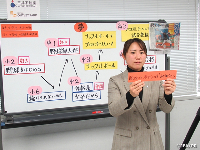 ただ、夢を叶えるまでの道のりは険しく、中学生になってから一緒に野球をしていた男子たちとの力の差を痛感し、さらには、女子は野球の試合に出場できないという高校野球の規定に夢を阻まれ本当につらい時期を過ごしたことも赤裸々に、子どもたちに打ち明けました。夢を叶えるまでの困難に直面した時に、自身の代名詞でもある“ナックルボール”と出会い、懸命に練習しながら習得し、ついにはプロへの道を切り開いたという話を通じて、「本当に好きなことや夢中になれることを大切にし、夢に向かってチャレンジし続けることが大切だよ」とメッセージを伝えました。