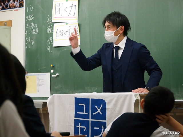 そして、2日目の3・4時間目に2組、5・6時間目に3組の2クラスの授業に横浜F・マリノスなどで活躍した兵藤慎剛さんが夢先生として登壇しました。体育館では、兵藤先生とチームになったクラスのみんなは、真剣にゲームに挑戦。失敗すると悔しがり、成功したときには「本気」で喜びを爆発させました。教室に移動してからの「トークの時間」では、兵藤先生が夢を見つけて夢にむかっていく中で、壁にぶつかり悩んだこと、そしてその壁を超える時にどういう事を考えていたのか、本当に夢にたどり着くか不安な時どうしていたのかなど、具体的に話していきます。話を聞いている子どもの中にはサッカーをやっているが体格差に悩んでいる児童もいて、「なるほど」と兵藤先生の話を自分に置き換えているかのように頷きながらメモを取って真剣に話を聞いていました。