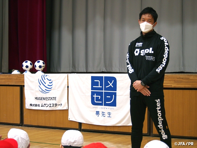 JFAこころのプロジェクトは2月8日(水)、9日(木)の2日間、中央区立有馬小学校の5年生3クラスに元プロサッカー選手の太田吉彰さんと兵藤慎剛さんを夢先生に迎え、株式会社ムゲンエステート協賛による「夢の教室」を開催しました。同社の旧本社が近隣にあった関係で始まった有馬小学校での授業も、一昨年、昨年は新型コロナウイルス感染症拡大防止のためオンラインでの実施となっていましたが、今年度は約2年ぶりに学校で行う対面授業となりました。