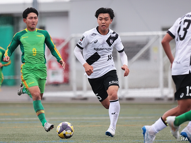 流通経済大学付属柏高校(千葉)は、その鹿島と勝ち点差1で2位につけています。DF廣瀬煌選手(#3)とMF島谷義進選手(#4)を中心とした堅守が持ち味で、失点数は青森山田高校(青森)に次ぐ少なさの「11」。攻撃面ではFW大藤颯太選手(#20/8得点)とFW金子琉久選手(#18/6得点)が得点ランキングの上位に顔を出す活躍を見せ、チームとしてはリーグトップの25得点を記録しています。