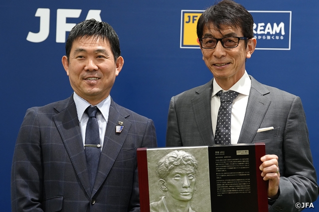2025年度 第21回日本サッカー殿堂のレリーフ盾贈呈式で森保一SAMURAI BLUE(日本代表)監督と