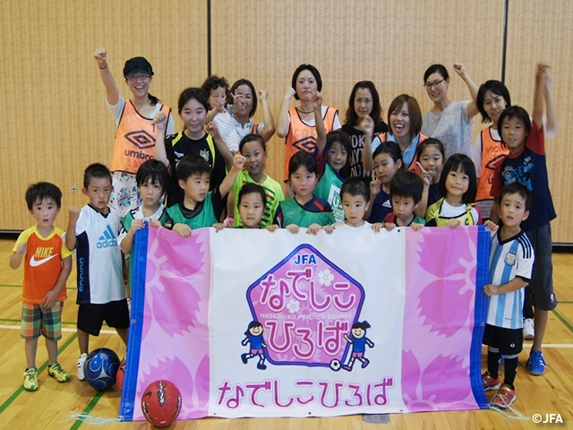 『JFAなでしこひろば』は、女性が、子どもから大人まで日常生活の中で定期的にサッカーやフットサルを気軽に「はじめて」「たのしみ」「つづける」ことのできる<場所>や<時間>のことです。運営者も募集しています。