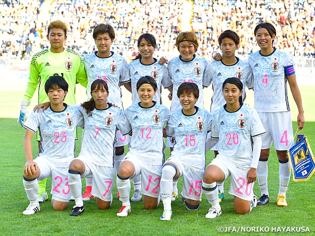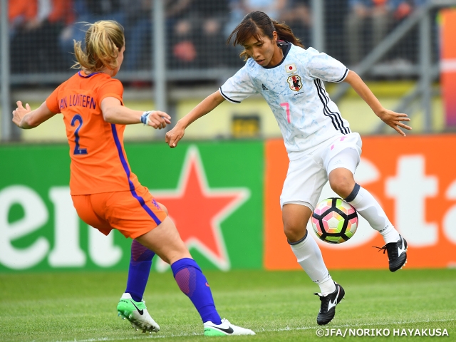 オランダのブレダで行われたこの試合、なでしこジャパンはGKに山下杏也加、ディフェンスラインは左から鮫島彩、市瀬菜々、熊谷紗希、大矢歩、中盤の底に阪口夢穂、猶本光、左右に中島依美、籾木結花、2トップに田中美南と菅澤優衣香の各選手を配置した4-4-2の布陣で臨みました。