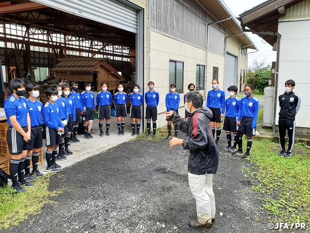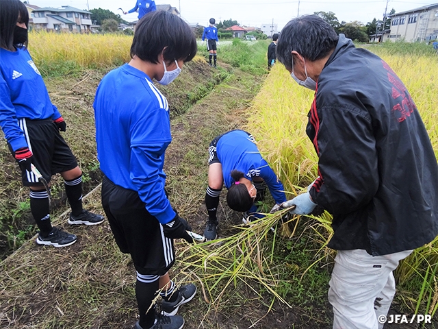 JFAアカデミー福島女子は9月27日(日)、JFAプログラム労作体験の一環として稲刈りを実施しました。新型コロナウイルス感染拡大の影響により、田植えを体験することは出来ませんでしたが、今年も御殿場市の佐藤孝吉さんのご協力により、稲刈りを体験でき、選手たちは有意義な時間を過ごすことができました。毎日食べているお米が自分たちのもとへ届くまでの様々な人の苦労を実感でき、今後の食事に対し、より感謝をもっていただくことが出来ると思います。