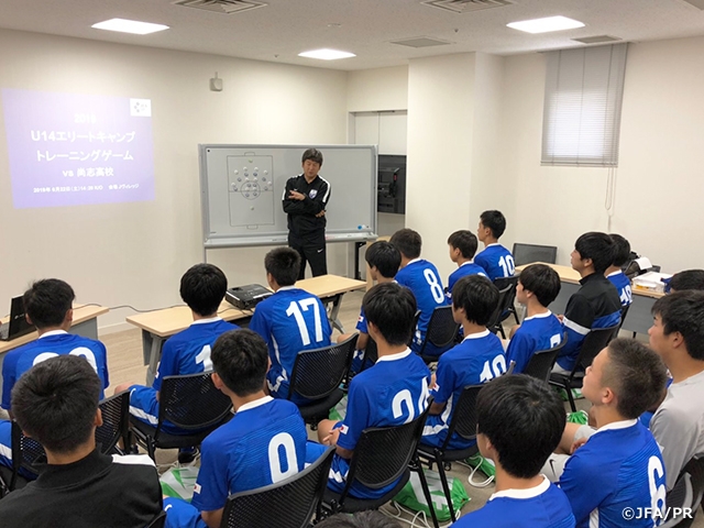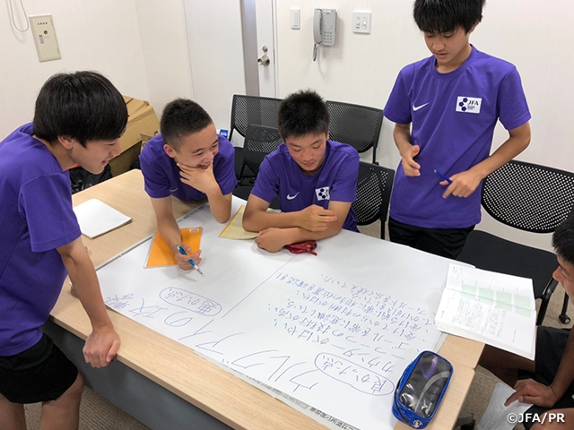 2日目には、同じ会場でキャンプを実施していたエリートプログラムU-14フューチャーキャンプ(9月以降生まれの選手が対象)のメンバーとのトレーニングマッチを行いました。3日目は、午前中にブラジルで開催されたコパ・アメリカ、SAMURAI BLUE (日本代表)対 ウルグアイ代表の試合を観戦し、午後のミーティングでは日本の攻撃・守備、ウルグアイの攻撃・守備について振り返り、グループごとに発表しました。4日目は尚志高校と練習試合を行い、4-1 (0-0, 0-3, 1-1)で敗戦したものの、自分たちより体の大きい選手と試合をすることで、自分たちの課題を見つける貴重な経験となりました。最終日には、午前中に紅白戦を行い、キャンプの成果を確かめました。