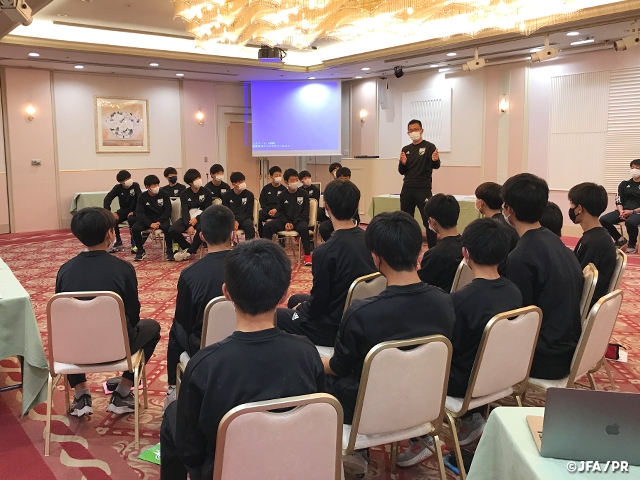 今年最後のエリートキャンプは、エリートキャンプ(フューチャー含む)経験者12名に初招集10名を加え、GK2名、FP20名で行いました。オフ・ザ・ピッチプログラムでは、帯同した濱田剛志ドクターから「新型コロナ感染対策」と「この年代の障がい」の特徴について、金山将大トレーナーから「サッカー選手のコンディショニング」「食事の摂り方」、フィジカルフィットネスプロジェクトの矢野由治氏より、30m走、立ち幅跳びなど測定結果のフィードバックと「世界で戦うためのフィジカル」、サポートコーチの秋葉勝コーチからは16年間のプロ生活の経験談など選手にとって貴重なレクチャーをしていただき、選手はたくさんの学びを得られたと思います。選手一人ひとりがキャンプを通じて自ら考えて行動し、「気づき」から「自立」して取り組んでくれました。