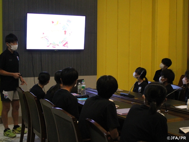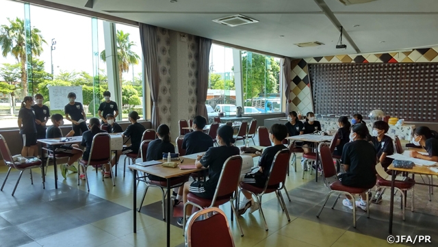 タイに指導者派遣されている、タイ女子代表/U-20タイ女子代表の岡本三代監督と轟奈都子GKコーチから、タイでの生活について、また日本でナショナルトレセンコーチ/ナショナルコーチングスタッフとして育成年代選手を指導していた頃の話をレクチャーしていただきました。世界で戦っていくためにまずこのアジアでの遠征経験が自分のためになり、力になっていくということを学び、今後の自分たちが目指すべき道を考えることが出来ました。選手たちはそれぞれのチームに戻りますが、この経験を日常活動に生かし、より大きな成長と次の活動での再会を約束して8日間の遠征を終えました。