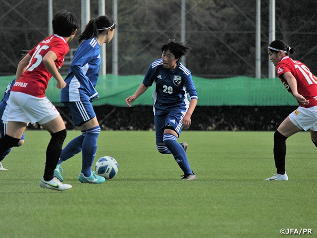 私はエリートプログラムに選ばれたのは2回目で、知らない人が半数いました。でもトレーニングなどでコミュニケーションをとることで、コンビネーションが増えたり、自分からも指示ができるようになったことがよかったです。チームではFWをやっていて、今活動でもFWをやりました。でもトレーニングでは点をとれるのに、試合で点をとることができなかったのが悔しかったです。他にも色々な経験ができました。まず初日のトレーニング後にSAMURAI BLUEのトレーニングを見れたことです。プレースピードが速く、クロスでのゴール率が高くとても勉強になりました。他には食事の大切さや、オフ・ザ・ピッチで何をするかなど、改めて考え直すことができました。食事は何を摂ったらいいのか、睡眠の3時間前に食事を済ませておくなど、今後に大切なことをたくさん学びました。また能仲女子副委員長や、U-16日本女子代表の白井監督から、なでしこになるため、代表選手になるために必要なことや今から変えれるものがあることを教わりました。今回のエリート活動では、色々なことを学べて改めて自分の今までの行動を見直し、今後の意識を変えていこうを思うことができました。また自チームに戻って、これらの経験を生かしていきたいです。