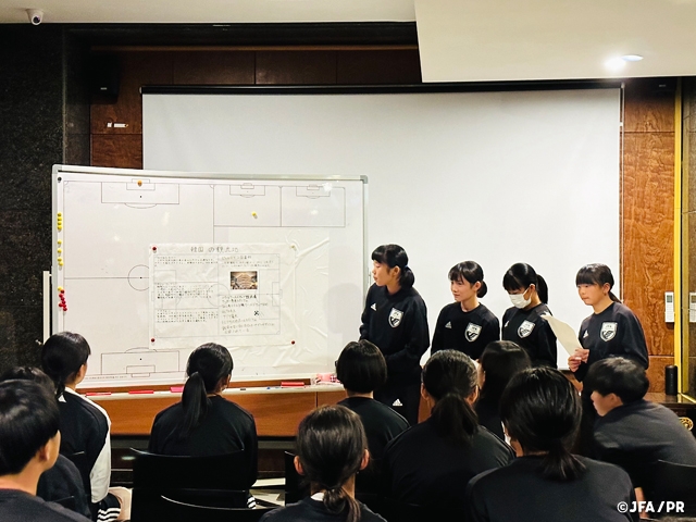 3日目は、「ゴールを目指す」「ゴールを奪う」の攻撃のテーマで午前・午後のトレーニングをし、夜は翌日のトレーニングマッチに備え、ミーティングでセットプレーの確認をしました。