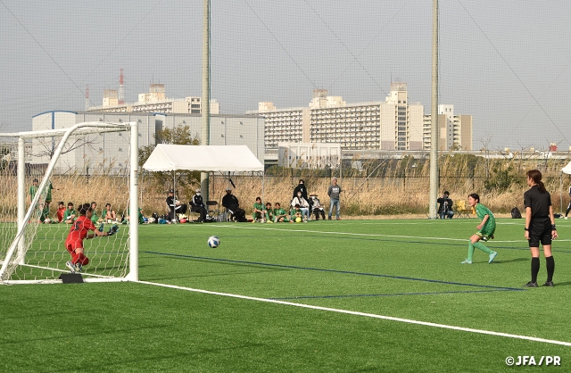 今回は、関西各府県からU-12の女子選手106名、指導者18名、帯同審判員6名が参加。初日は各県ごとにJFAのスタッフによるトレーニングと2試合の交流戦、昼・夜2回のレクチャーを、2日目には、各県ごとのトレーニングと3試合の交流戦を行いました。今回の交流戦では、試合時間内で試合が決した場合も、1日目は3名ずつ、2日目は4名ずつのPK戦を行い、全選手が必ず一度はキッカーを経験する機会を作りました。