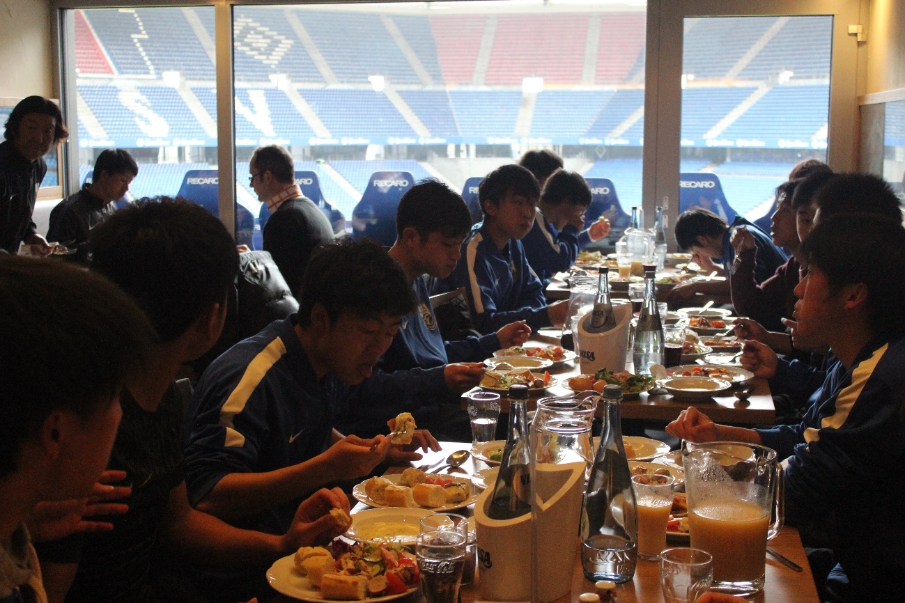 練習後の昼食は、ブンデスリーガ1部所属のHamuburger SVのスタジアム内にあるレストランで食事でした。