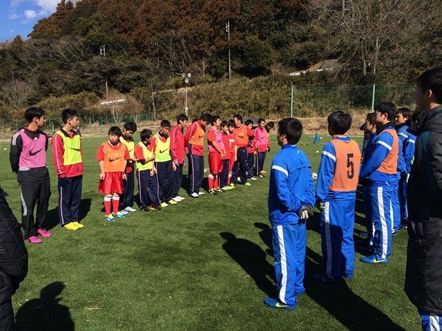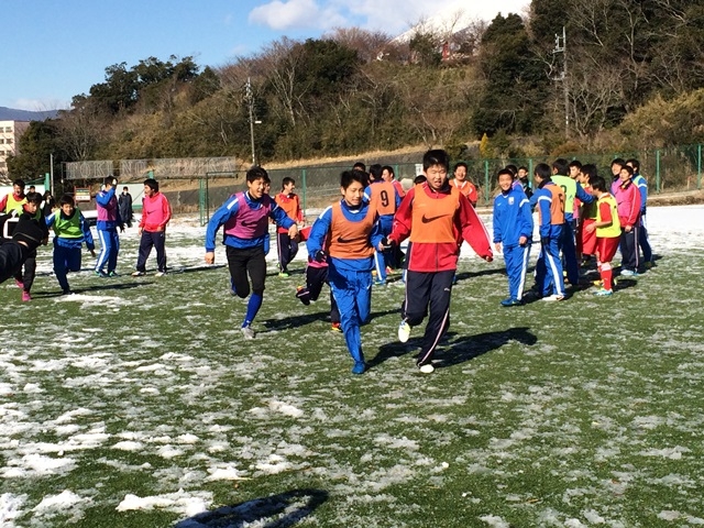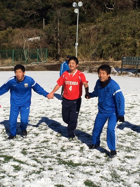 当日は、雪が積もっておりグランドのコンディションはよくなかったですが、御殿場特別支援学校の選手の皆さんはグランドに到着すると、すぐに笑顔になり、一緒にボールを蹴って楽しみました。最初の練習として鬼ごっこをしました。みんな笑顔で無我夢中に走り、とても盛り上がりました。その次に、ボールを使ってドリブル競争ゲームをして、最後にはアカデミー生と御殿場特別支援学校の混合チームを4チームつくりミニゲームをしました。各チームのアカデミー生がそれぞれ工夫してくれて大変良い雰囲気で終わることができました。