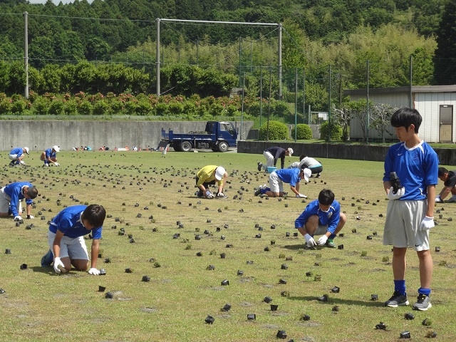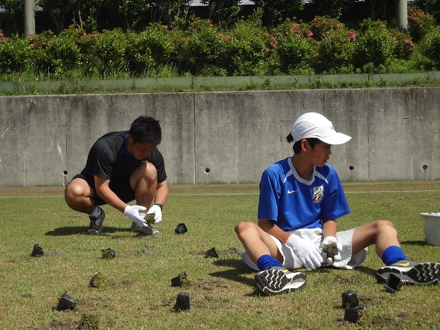 6月4日(日)にJFAプログラムとして、時之栖Cグラウンド(天然芝)の芝の苗植えをしました。今回の苗植えは、中学2・3年生で行いました。