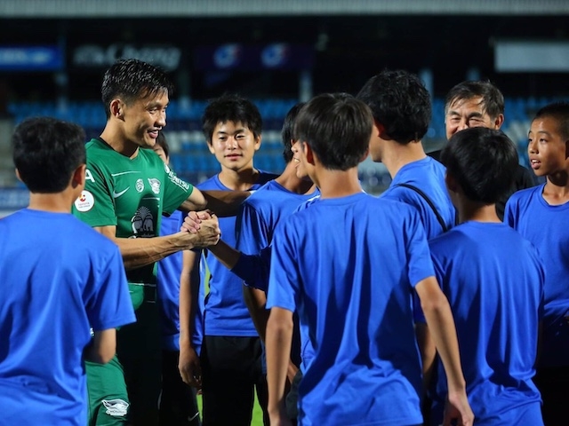 4日目の活動の最後は、タイリーグの観戦でした。試合はチョンブリFCとバンコクユナイテッドの試合でした。内容として、一人一人のフィジカルがとても強く、Jリーグに比べるとコンタクトプレーがすごく多かったです。アカデミーの加藤好男GKコーチが以前、チョンブリFCのGKコーチをしていた関係で、試合後にピッチに入れてもらい、チョンブリFCの選手と交流することができました。