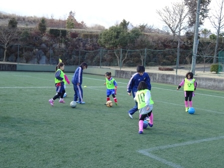 4チームに分かれて、ドリブルやシュートなど基礎的なものを、遊びながら練習しました。