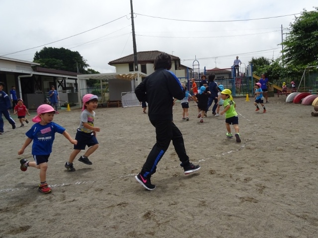 サッカー教室が始まり、まずは鬼ごっこをしました。